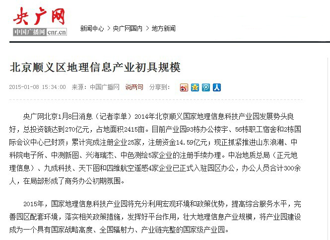 2015年1月8日,中国广播网发布了《北京顺义区地理信息产业初具规模》消息。现将全文转发如下: